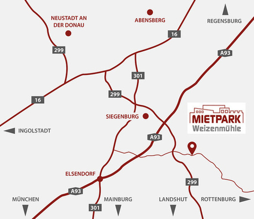 Der Mietpark Weizenmühle liegt optimal zwischen Landshut, Regensburg, Ingolstadt und München. Über die A93 ist auch eine schnelle Verbindung zur A9 Richtung Nürnberg oder über Regensburg zur A3 in Richtung Passau kein Problem. Über die B299 gelangen Sie schnell nach Landshut und von dort aus über die A92 zum Flughafen München. Die B16 ist Ihre Straße nach Ingolstadt.